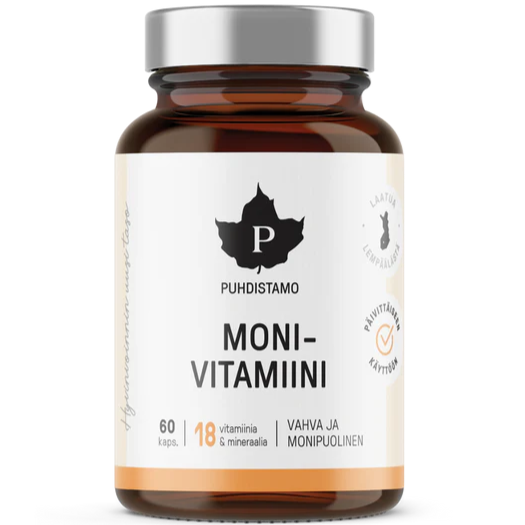 Puhdistamo Multivitamin is a strong and balanced daily multivitamin packed with 18 carefully selected nutrients to support your immunity, energy, and overall well-being. This premium-quality formula uses only the most bioavailable vitamin and mineral forms, with no fillers or unnecessary additives.